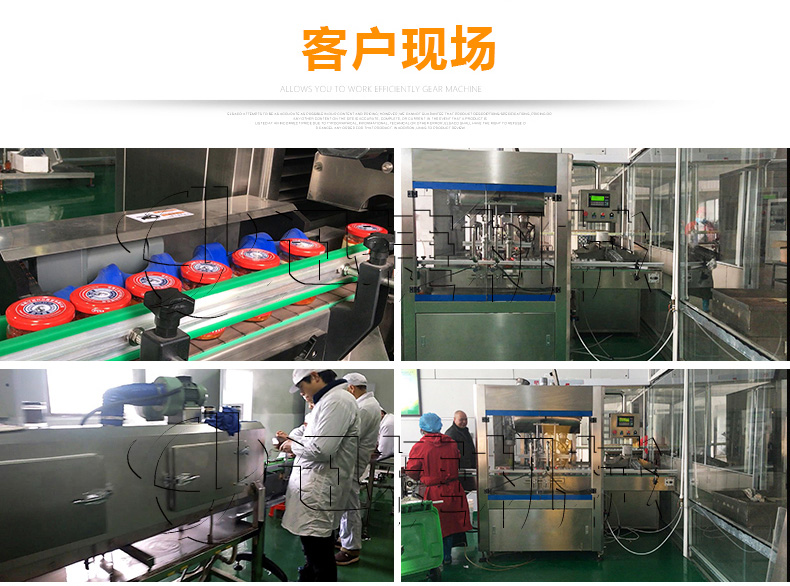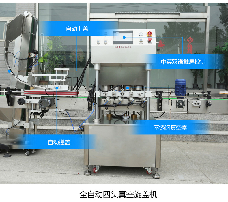 該生產(chǎn)線適合中小口徑三旋、四旋玻璃瓶調(diào)味醬的分裝,適合醬料、含顆粒黏稠物料的灌裝,物料接觸部分均采用316不銹鋼,整機(jī)304不銹鋼,符合食品衛(wèi)生標(biāo)準(zhǔn)。該機(jī)設(shè)計(jì)合理,機(jī)型小巧,立式結(jié)構(gòu),節(jié)省場地,操作方便。啟動部分均采用FESTO和臺灣AirTack的氣動元件。灌裝閥有氣動閥控制,灌裝精度更高,灌裝量和灌裝速度均可任意調(diào)整,灌裝悶頭采用防拉絲及升降灌裝裝置。