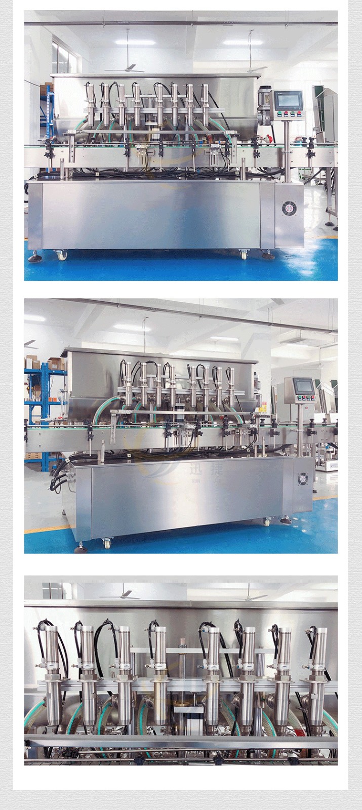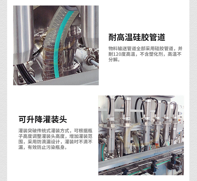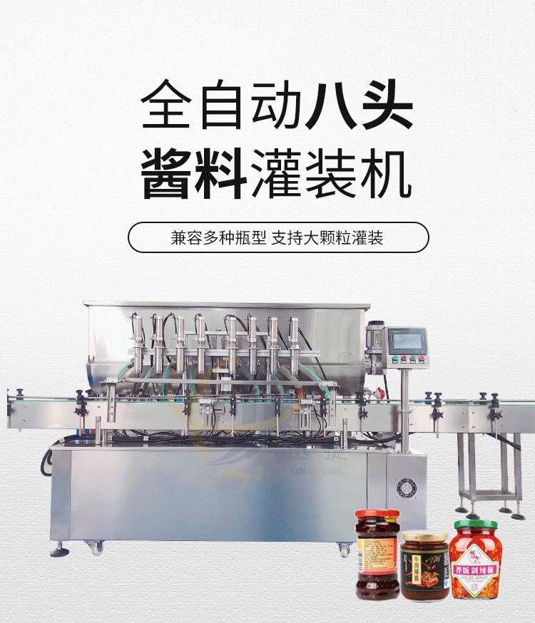 全自動(dòng)八頭醬料灌裝機(jī)采用活塞式灌裝原理,適用于調(diào)味品中帶顆粒并且濃度較大的辣椒醬、豆瓣醬、花生醬、香菇醬、果醬