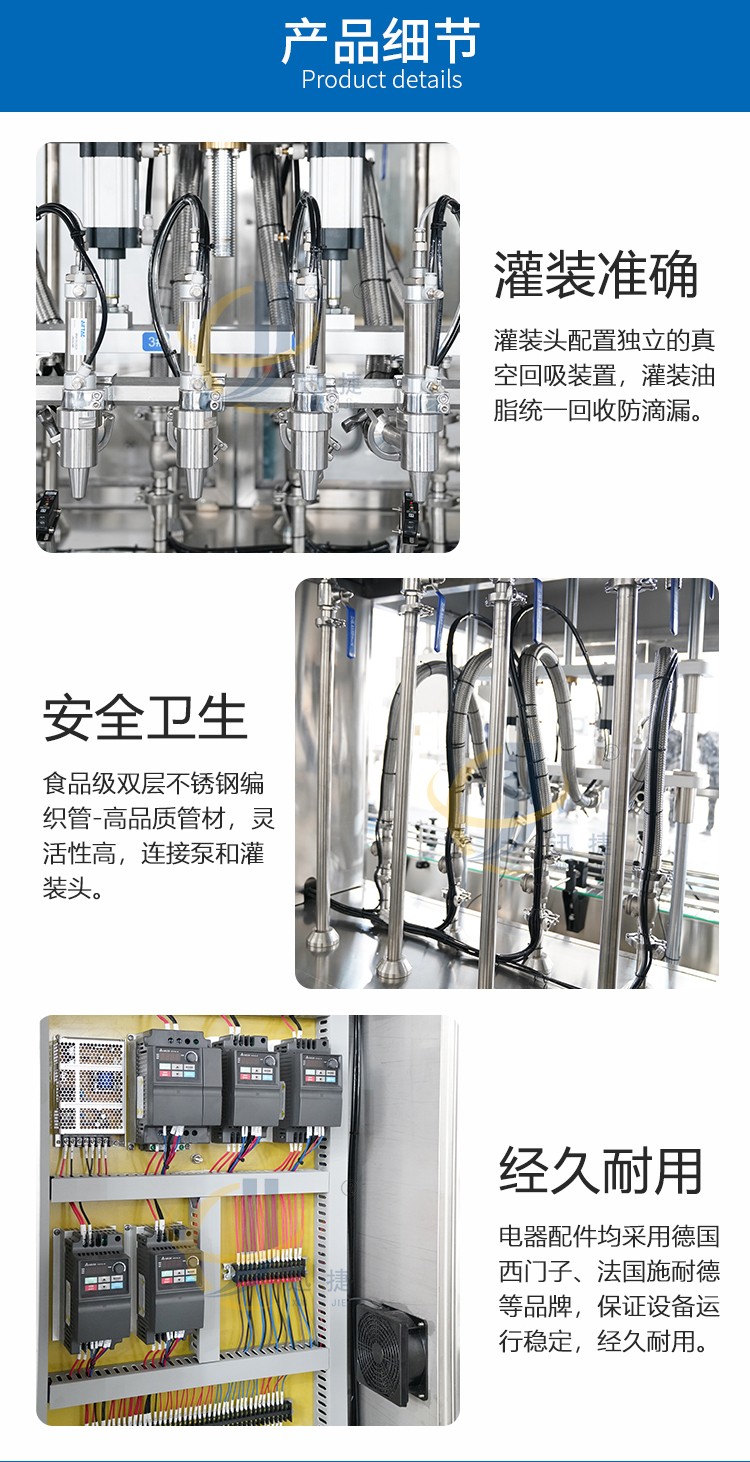 食用油灌裝生產(chǎn)線2-16頭可定制,兼容6種瓶型,容量范圍內(nèi)可兼容多種瓶型的灌裝,一鍵式操作,開(kāi)機(jī)即能使用。