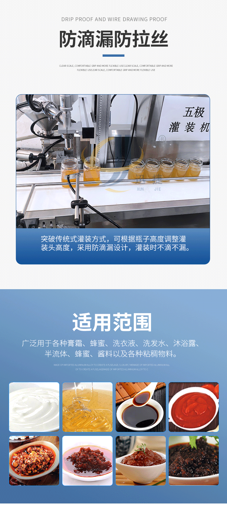五極灌裝機(jī):極快-單頭2200瓶/時 極簡-操作簡單 極廣-啥啥都能灌 極穩(wěn)-24小時不停機(jī) 極準(zhǔn)-200g誤差小于1g。