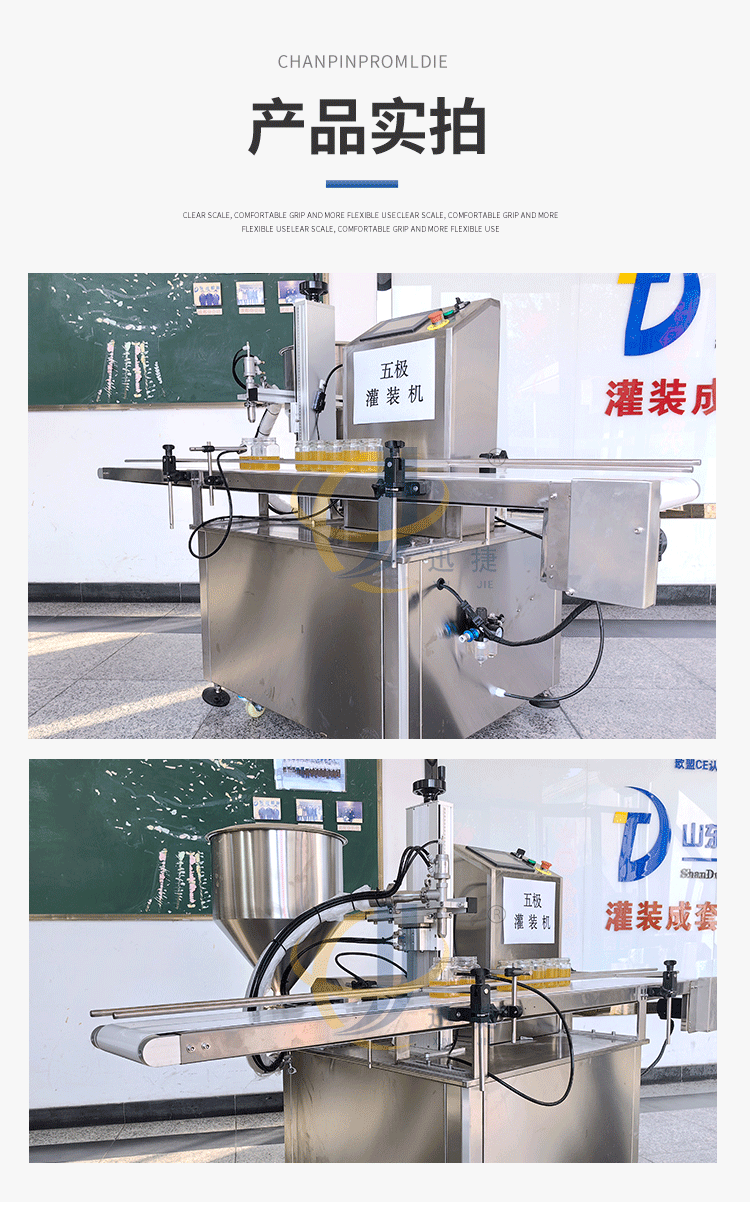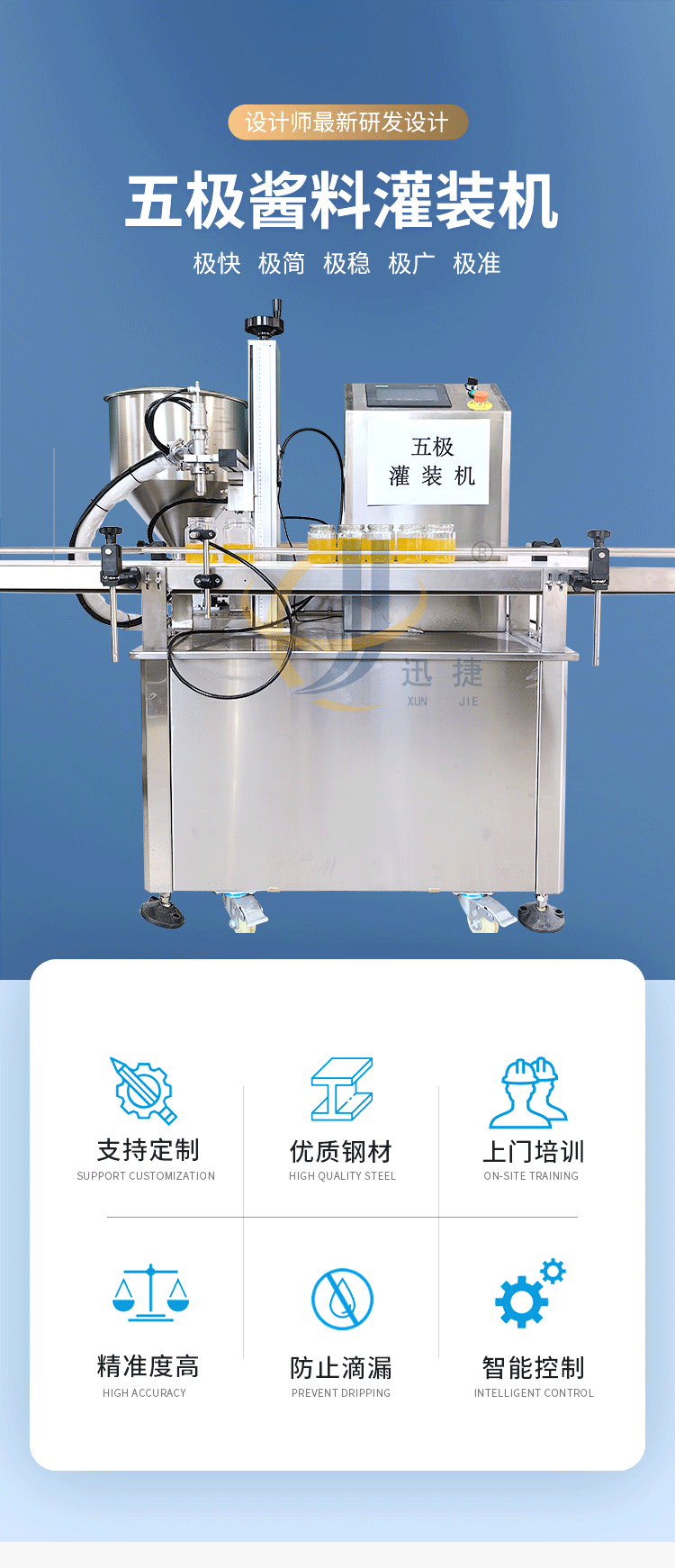 五極灌裝機(jī):極快-單頭2200瓶/時 極簡-操作簡單 極廣-啥啥都能灌 極穩(wěn)-24小時不停機(jī) 極準(zhǔn)-200g誤差小于1g。它可以和真空旋蓋機(jī)搭配使用。