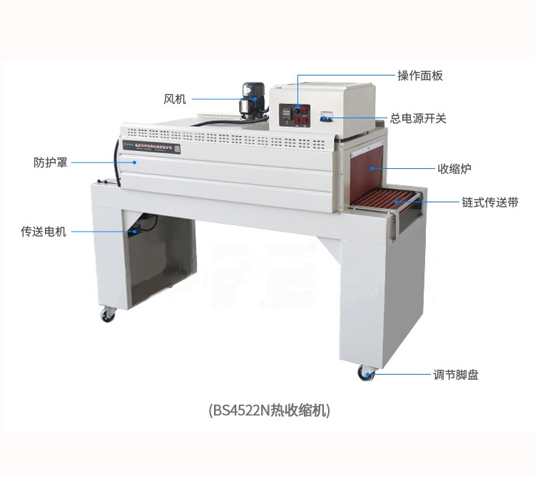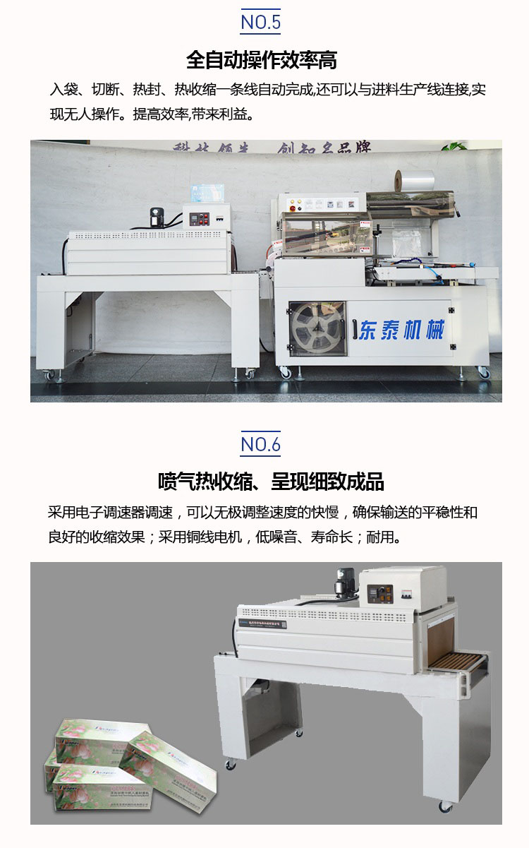 自動塑料膜熱收縮包裝機(jī)結(jié)構(gòu)緊湊占地面積小,非常適合配套自動包裝流水線完成產(chǎn)品的自動無人化包裝,適合于單個物品包裝或有底托物品包裝。自動送膜打孔裝置和手動調(diào)節(jié)的導(dǎo)膜系統(tǒng)以及手動調(diào)節(jié)的進(jìn)料輸送平臺,可適于不同寬度和高度的產(chǎn)品,實(shí)現(xiàn)一臺機(jī)器滿足各種尺寸的包裝物品。