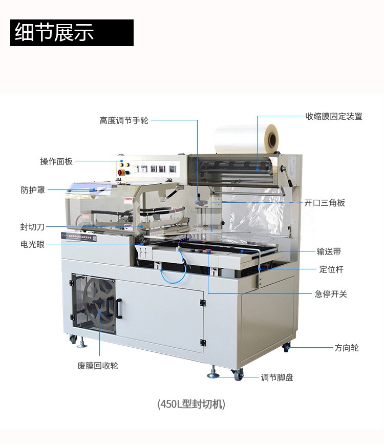 配合L型封切刀使收縮膜包裝一次封切成型,鍍特氟龍不粘層封口布,封切不黏膜,且封口整齊不開裂,產(chǎn)品經(jīng)封切后,進(jìn)入自動塑料膜熱收縮包裝機(jī)完成包裝。