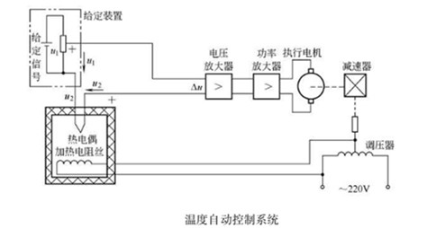 如果將控溫過程中的人工操作 (檢測和調(diào)節(jié)) 換由自動控制裝置完成,則成為包裝機(jī)自動控溫系統(tǒng)。如下圖所示,檢測元件熱電偶檢測恒溫箱內(nèi)的溫度,并將溫度轉(zhuǎn)換為對應(yīng)的電壓信號2 ,同時反饋給比較器。比較器比較表示給定溫度的給定電壓信號1與檢測電壓信號2的大小,得到溫差信號,其大小和正負(fù)代表溫差的大小和方向。溫差信號△經(jīng)電壓放大和功率放大后,控制執(zhí)行電機(jī)的轉(zhuǎn)速和方向,執(zhí)行電機(jī)通過傳動裝置拖動調(diào)壓器觸頭調(diào)節(jié)供熱電壓。當(dāng)溫度偏高時,動觸頭向著減小電壓( 電流)方向轉(zhuǎn)動; 反之,當(dāng)溫度偏低時,動觸頭則向著增大電壓( 電流)方向運動,直至恒溫箱內(nèi)溫度達(dá)到給定溫度,溫差信號△=0 時觸頭停止運動。