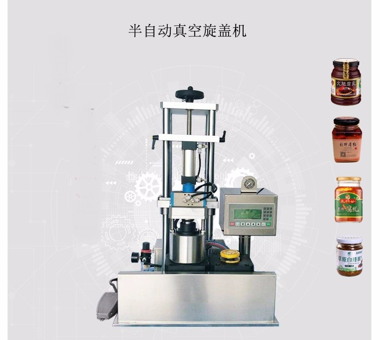 半自動(dòng)辣椒醬真空旋蓋機(jī)顧名思義是旋蓋真空一體機(jī),集抽真空旋蓋于一體。