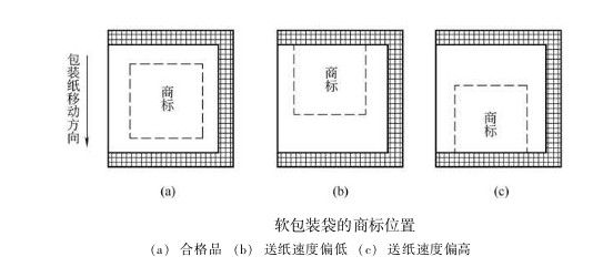 在包裝作業(yè)過程中,卷筒半徑逐漸減小,包裝紙所受張力發(fā)生變化,送紙輥與包裝紙之間的摩擦因數(shù)受環(huán)境溫濕度的影響而發(fā)生波動,加上商標印刷誤差,以及送紙、縱封、橫封、切斷各部分速度的差異等因素,使得刀輥的實際切線偏離規(guī)定部位。即使這種位置誤差很小,例如在某—包裝袋上只偏差0.1mm,但包裝機速度很快,有的高達200包/min, 如不加以控制調(diào)節(jié),機器運行1垃i六 后,誤差積累可達20mm,切線嚴重偏離規(guī)定部位,降低了包裝質(zhì)量,甚至造成廢品。如圖所示,圖(a)為合格品; 圖 (b) 為送紙速度偏低,商標后移; 圖 (c) 為送紙速度偏高, 商標前移。 為了保證包裝袋的正確封切, 必須在卷筒紙供送系統(tǒng)中, 引人商標圖案自動位置檢測與控制系統(tǒng)。目前應(yīng)用廣泛的是光電自動定位系統(tǒng)。